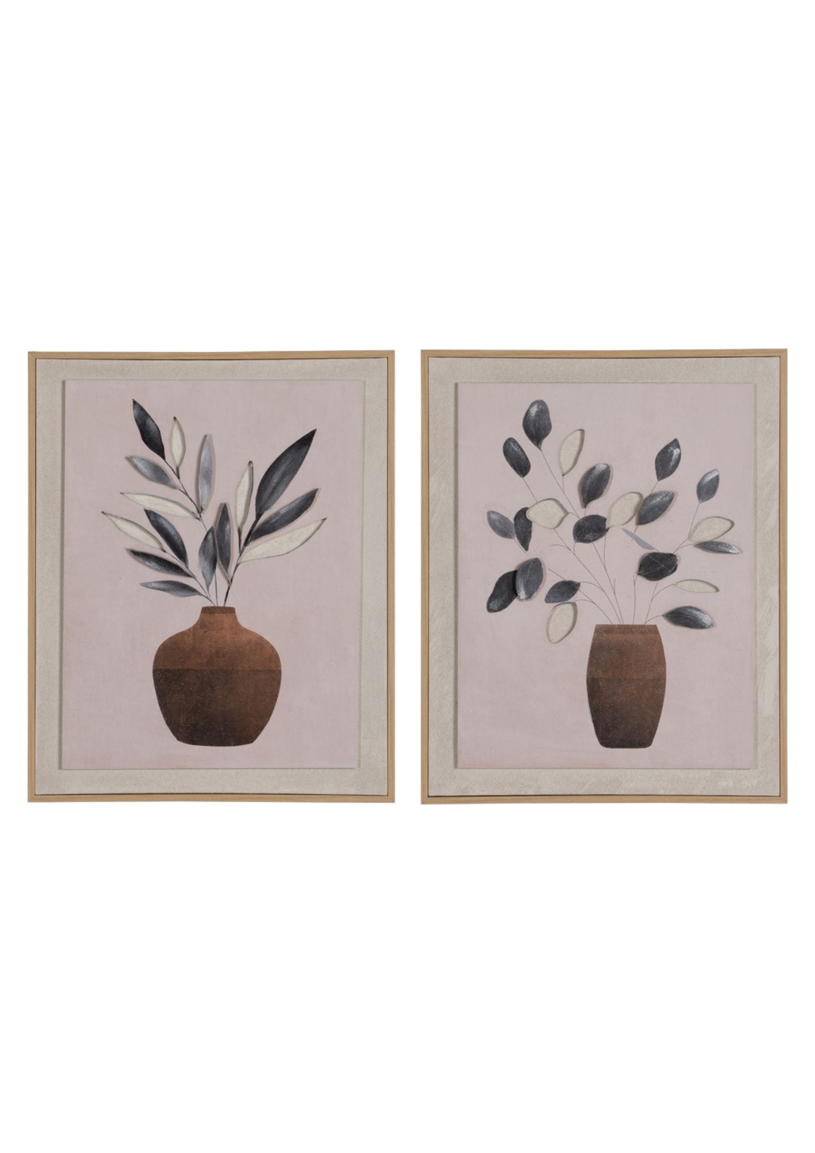 Bring a sense of calm and elegance to your home with the Serene wall art set that is 50% hand=painted. Each piece features an earthy-toned vase with delicate branches and leaves in soft neutral shades, creating a harmonious and natural composition.